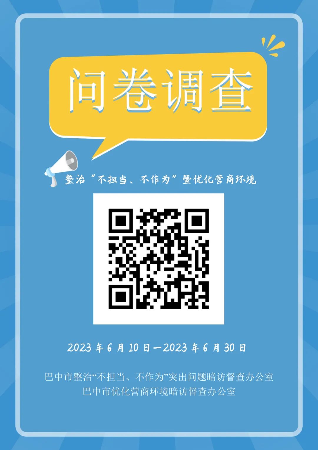 為深入整治“不擔當、不作為”突出問題,更好地了解全面從嚴治黨、決策部署落實、優(yōu)化營商環(huán)境、推動鄉(xiāng)村振興、保障民生改善、防范化解風險等方面的情況,以及廣大干部群眾和企業(yè)對干事創(chuàng)業(yè)環(huán)境的切身感受,按照市委、市政府工作安排,巴中市整治“不擔當、不作為”突出問題暗訪督查辦公室、巴中市優(yōu)化營商環(huán)境暗訪督查辦公室決定開展整治“不擔當、不作為”突出問題暨優(yōu)化營商環(huán)境網(wǎng)絡問卷調(diào)查,調(diào)查時間為2023年6月10日至6月30日。
