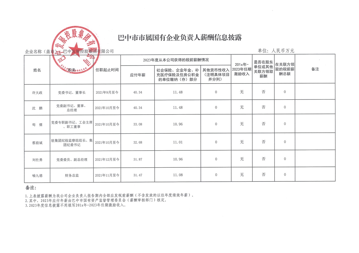 巴中市市屬國有企業(yè)負(fù)責(zé)人薪酬信息披露