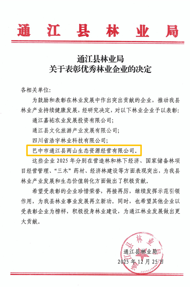 近日,巴中兩山公司被巴中市林業(yè)局通報(bào)表?yè)P(yáng)為2025年度林業(yè)重點(diǎn)工作“表現(xiàn)突出單位”。下屬企業(yè)通江縣兩山公司被通江縣林業(yè)局授予“優(yōu)秀林業(yè)企業(yè)”稱號(hào)。